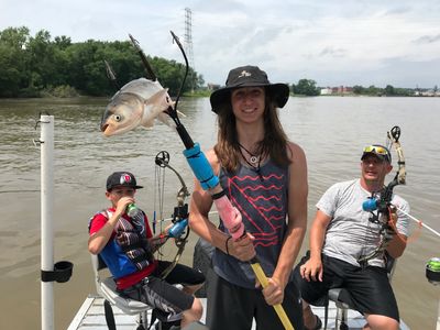 Asian carp jump because of vibration and water turbulance. This is why aluminum boats with two stroke motors work the best. With that said, my mainline boat is a custom all aluminum triton pontoon boat that has been overhauled and customized specifically for this sport. This boat gets the asian carp popping like popcorn. I also have a custom 22ft SeaArk Mod-V Jon boat. I use this boat as a back up as well as my traditional bowfishing boat. I modified my boats to allow five people and possibly 6 shoot at the same time. The rest may comfortably hang out on padded bench seats, enjoying refreshments, blasting their choice of music over the sound system and watching their buddies slay carp. It truly does not get any better than that! Even if bowfishing isn't your thing, or you have kids that want to join in the fun, I also have nets they can use to catch the fish as they jump.